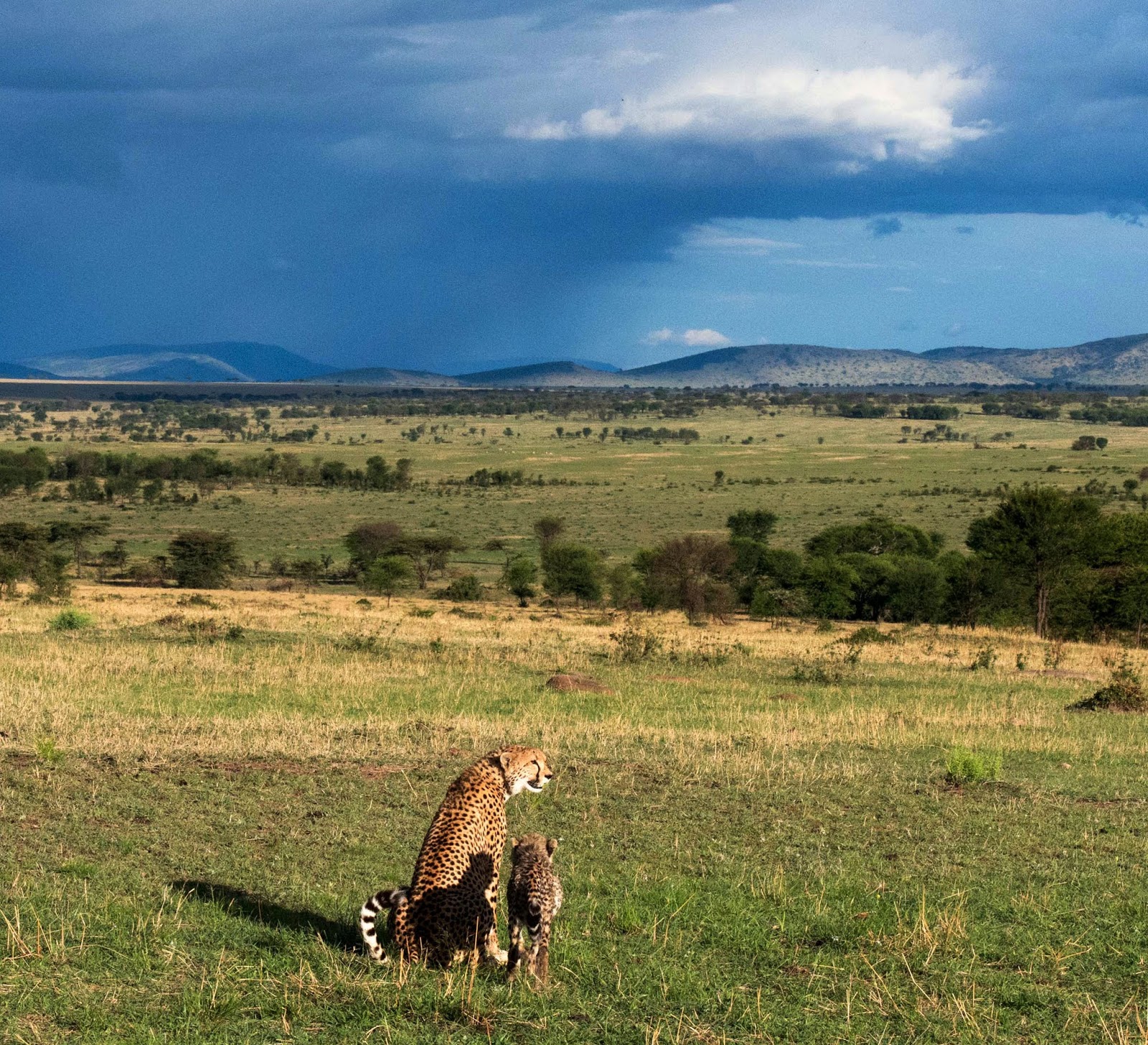 An afternoon storm approaches as these cheetah relax after feeding on a Thompson's gazelle. Mum is a fairly small cheetah doing a great job of feeding and raising three cubs on her own in the Serengeti National Park, Tanzania